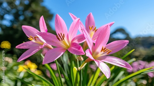 Naklejka premium Beautiful Pink Flowers Blooming Under Clear Blue Sky in Vibrant Garden Scene