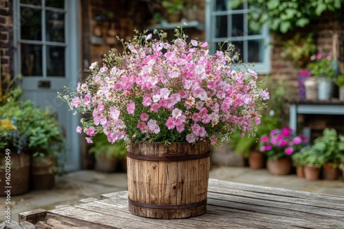 © ChaoticMind, Obraz premium Beautiful pink flowers in a rustic wooden barrel planter at a charming garden setting