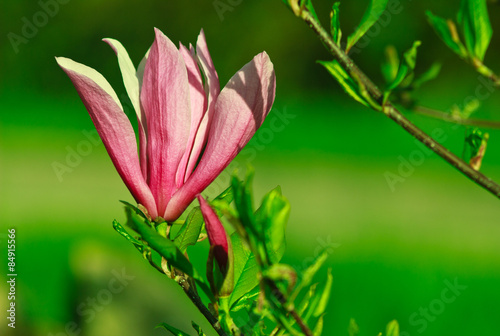 © vovik_mar, Fototapeta premium Beautiful pink Magnolia flower on green backgrounds.