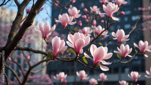 © TheWaterMeloonProjec, Naklejka premium Beautiful pink magnolia tree in full bloom with city buildings in the background, illustrating the contrast between nature and urban landscape. Melbourne, Australia
