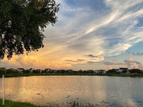 Fototapeta premium Beautiful pink, orange and blue sunset reflecting on a lake