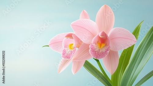 Naklejka premium Beautiful pink orchids against a soft blue background, symbolizing elegance...