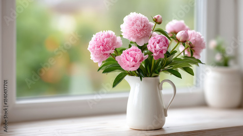© Sergey, Fototapeta premium Beautiful pink peonies on kitchen windowsill in spring
