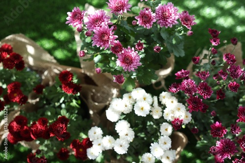 © New Africa, Fototapeta premium Beautiful pink, red and white chrysanthemum flowers on green grass, top view