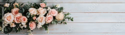 © Mnt, Obraz premium Beautiful pink roses arranged elegantly against a soft wooden background.