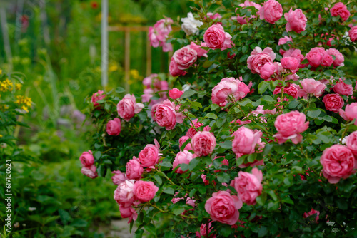 Fototapeta premium Beautiful pink roses in the garden of pink roses. Blooming Roses on the Bush. Growing roses in the garden