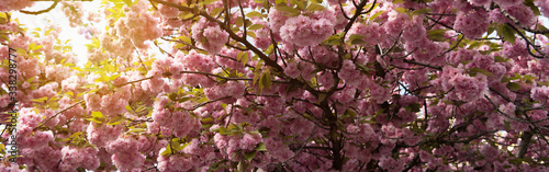 Obraz premium Beautiful pink sakura flowers (cherry blossoms), wallpaper background, panoramic soft focus