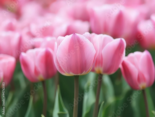 Fototapeta premium Beautiful pink tulips in a vibrant garden, showcasing fresh blooms and lush...