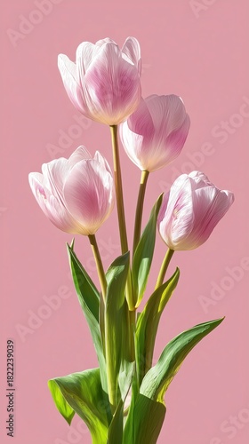 Fototapeta premium Beautiful Pink Tulips With Green Leaves Against a Soft Pink Background