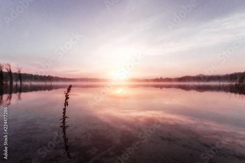 © Aliaksandr Marko, Fototapeta premium Beautiful, pink violet dawn over the lake. Fog over the lake, the rays of the sun, very dense fog, dawn, the blue sky over the lake, the morning comes, the forest reflects in the water.