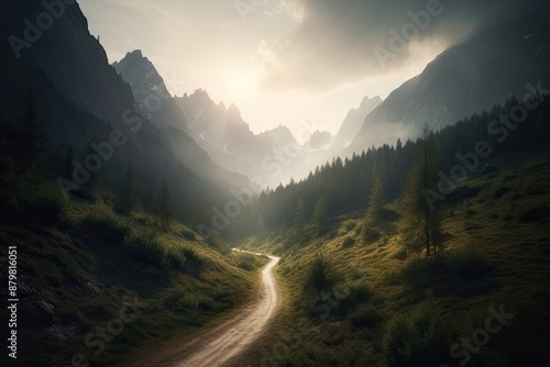 © mahdee, Obraz premium Beautiful place with green scenery, mountain, tree, sky, road, cloud.AI generated image.