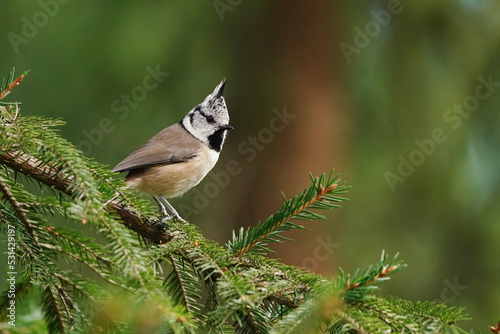 © Monikasurzin, Obraz premium Beautiful portrait of a crested tit. Lophophanes cristatus. Titmouse with crest sitting on the spruce twig. Wildlife scene from european nature.