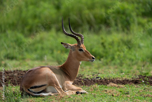 Naklejka premium Beautiful portrait of an Impala male with awesome trophy horns sitting down on the ground in the lush green bushveld of South Africa