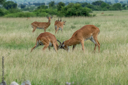 © Vicente, Fototapeta premium Beautiful portrait of two impalas fighting or playing in a national park in Uganda, Africa