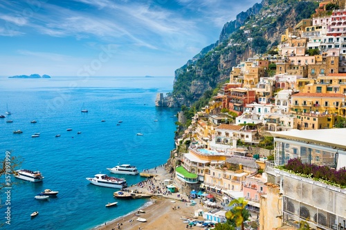 Naklejka premium Beautiful Positano on hills leading down to coast and azure sea on Amalfi Coast in Campania, Italy.