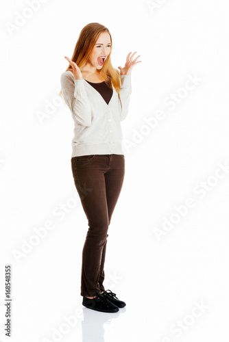 © Piotr Marcinski, Fototapeta premium Beautiful positive and casual woman expressing surprise.