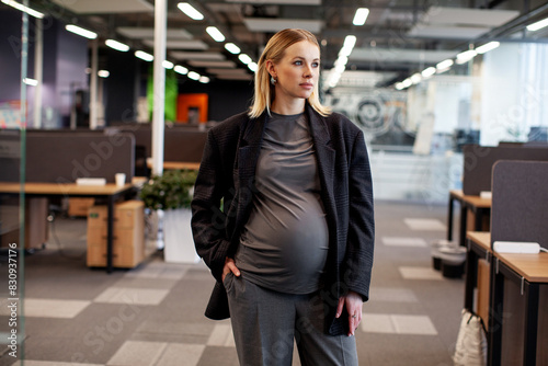 Fototapeta premium Beautiful pregnant businesswoman in an office, dressed in stylish maternity business attire consisting of a blazer and pants, showcasing professionalism and modern fashion