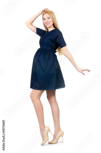 Naklejka premium Beautiful pregnant woman in blue dress isolated on white