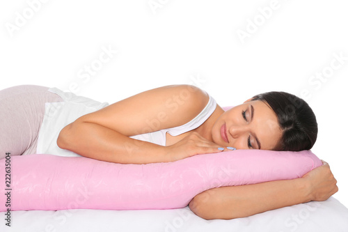 Fototapeta premium Beautiful pregnant woman sleeping with maternity pillow on bed against white...