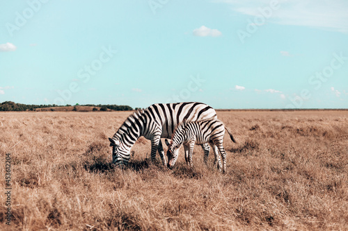 © Shi , Naklejka premium Beautiful pregnant zebra and cute baby are walking along the steppe and eating grass on sunny day. Wild horse in the reserve