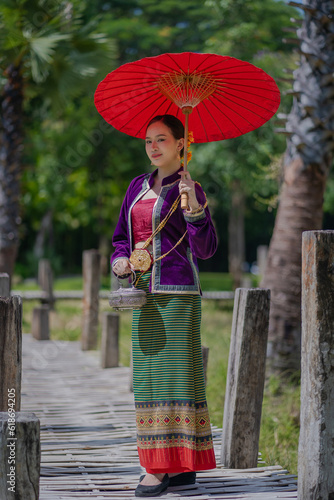 Obraz premium Beautiful pretty young Asian woman wearing a millionaire traditional Thai dress Lanna style standing with an antique silver bag and umbrella in a green natural park.