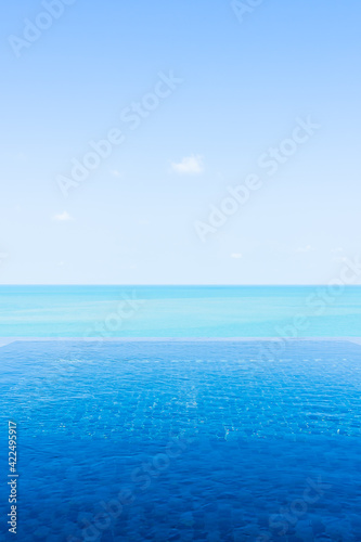 Fototapeta premium Beautiful private infinity outdoor swimming pool with sea ocean white cloud and blue sky view