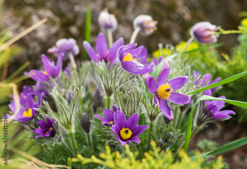 Fototapeta premium Beautiful Pulsatilla or Eastern pasqueflower blooming in a spring meadow