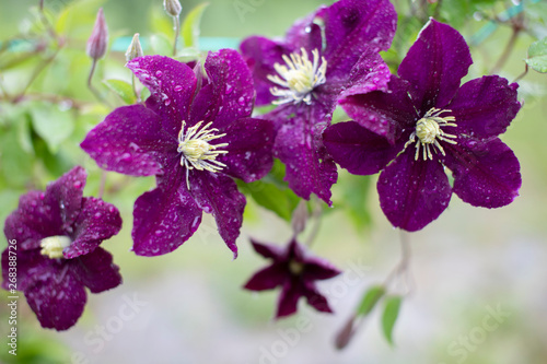 Fototapeta premium beautiful purple clematis flowers covered with water droplets after summer rain
