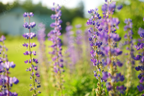 Fototapeta premium Beautiful purple lupins blossoming on flower bed on summer day.