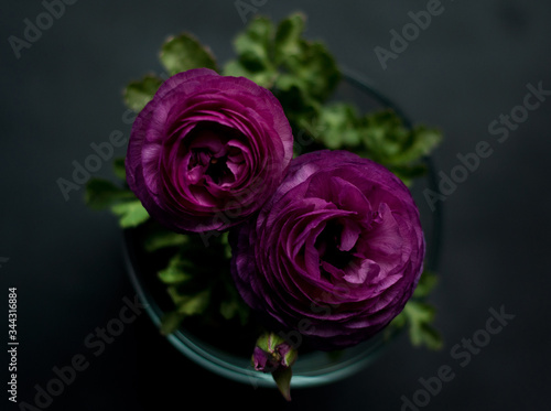 © Oksana, Fototapeta premium Beautiful purple ranunculuses flowers close up on dark background. Ranunculus cultivation.