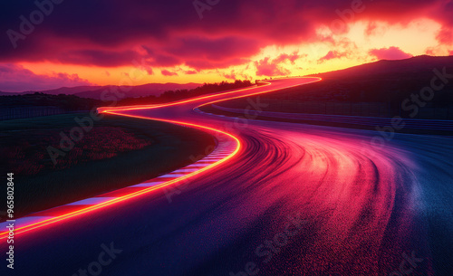 © Neon_Drop, Naklejka premium Beautiful race track with glowing lines at sunset, wide angle. Racing background