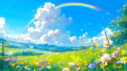 Obraz premium beautiful rainbow on sky blue with green field and tree style anime