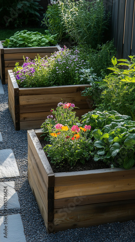 Obraz premium Beautiful raised wooden garden beds with blooming flowers and green herbs - vibrant and organized backyard oasis.