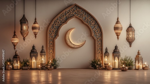 © Aisha, Fototapeta premium Beautiful Ramadan frame with geometric Islamic motifs, crescent moon, and lanterns, isolated on a plain background