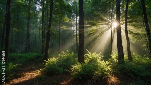 Obraz premium Beautiful rays of sunlight in a green forest