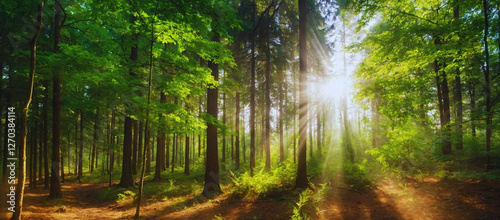 © farah, Obraz premium Beautiful rays of sunlight in a green forest