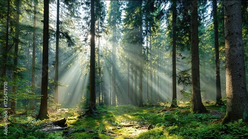 Obraz premium Beautiful rays of sunlight in a green forest