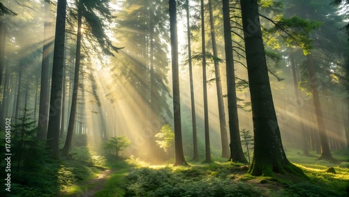 © Zainab, Naklejka premium Beautiful Rays of sunlight in a green forest