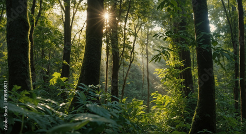Fototapeta premium Beautiful rays of sunlight in a green forest
