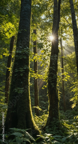 Fototapeta premium Beautiful rays of sunlight in a green forest