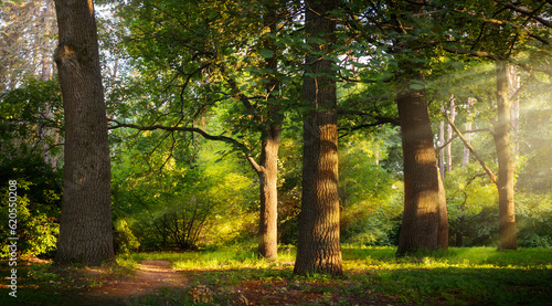 Obraz premium Beautiful rays of sunlight in a green summer oak forest;