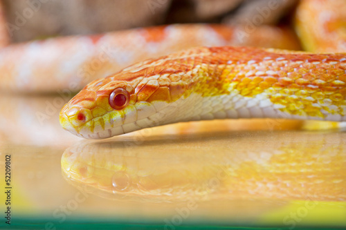 © Tatiana Katsai, Naklejka premium Beautiful red albino corn snake reptile on yellow green blurred