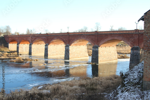 © Artūrs Stiebriņš, Naklejka premium Beautiful red brick bridge view over a small river flowing through village , countryside city.
