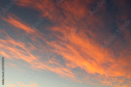 © far700, Fototapeta premium Beautiful red cirrus clouds at sunset. Background. Landscape.