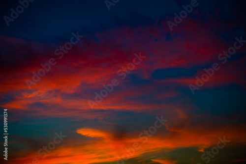 Fototapeta premium Beautiful red clouds in the dark blue sky, summer sunset