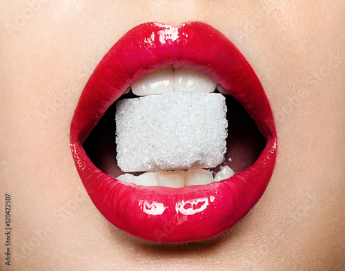 Fototapeta premium Beautiful red female lips with a piece of sugar in his mouth