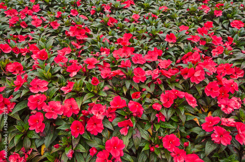 Fototapeta premium Beautiful red flowers of impatiens close up