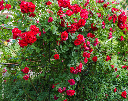 © lizaveta25, Fototapeta premium Beautiful red flowers of spray roses with a garden in the village. Summer landscape.