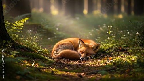 © MassSahan, Fototapeta premium Beautiful Red Fox Sleeping Peacefully in a Sunlit Forest Glade among Ferns and Wildflowers