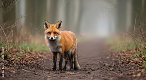 Fototapeta premium Beautiful red fox standing on a path in a foggy autumn woodland